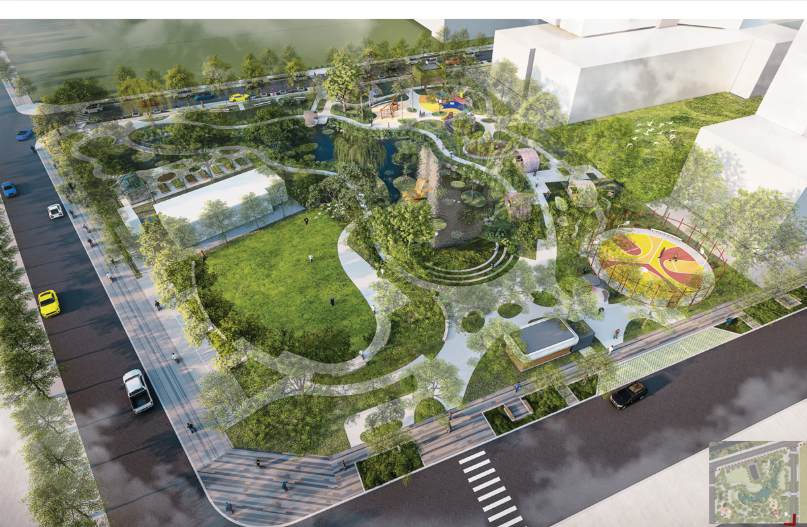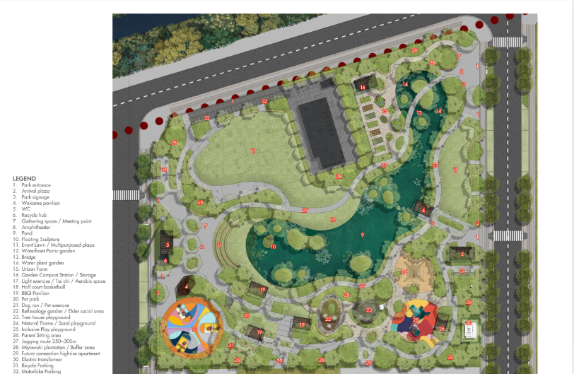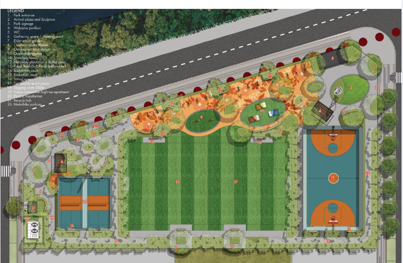 - Mục tiêu thiết kế: Tạo ra một không gian công cộng bền vững, đa chức năng với nhiều tiện ích phục vụ cho các hoạt động thể thao, giải trí, thư giãn và kết nối cộng đồng. Đây là nơi gắn kết người dân, từ trẻ em đến người cao tuổi, với các hoạt động phù hợp với nhu cầu của từng nhóm đối tượng.