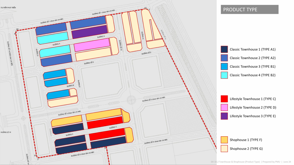 Dự án cung cấp 4 loại layout nhà phố, đặt tên thân thuộc là Tùng, Cúc, Trúc và Mai. Mỗi loại có đặc điểm riêng về số lượng phòng ngủ, phòng tắm và không gian sinh hoạt, cùng hệ thống mã căn để dễ nhận diện. Đặc biệt, các căn đầu hồi có diện tích rộng hơn và số phòng ngủ nhiều hơn, phù hợp với nhu cầu gia đình đông người.