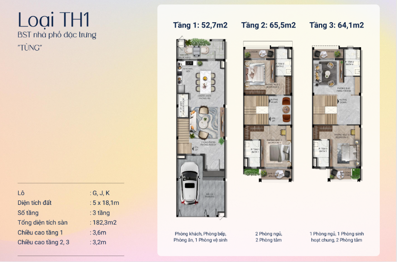 | Tùng | TH1, TH1M, TH1e1, TH1e1M, TH1e2, TH1e2M, TH1c, TH1cM, TH2e, TH2eM | 4 phòng ngủ | 5 phòng ngủ | 4 phòng tắm + 1 toilet riêngPhòng khách, phòng ăn, bếp |