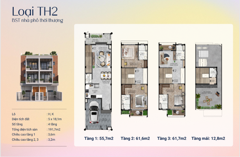 | Gió | TH2, TH2e, TH2eM | 3 phòng ngủ | 4 phòng tắm + 1 toilet riêngPhòng khách, khu ăn uống, bếpPhòng sinh hoạt chung | – Phòng khách đặt phía sau, hướng vào không gian riêng tư- Có sân thượng |