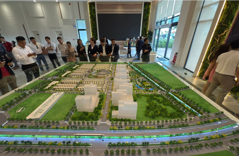 - Sa bàn và mô hình thu nhỏ: Tại khu vực trung tâm nhà mẫu, khách tham quan có thể xem tổng thể dự án qua sa bàn và các mô hình nhà phố, shophouse trong tương lai.