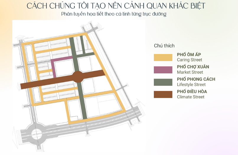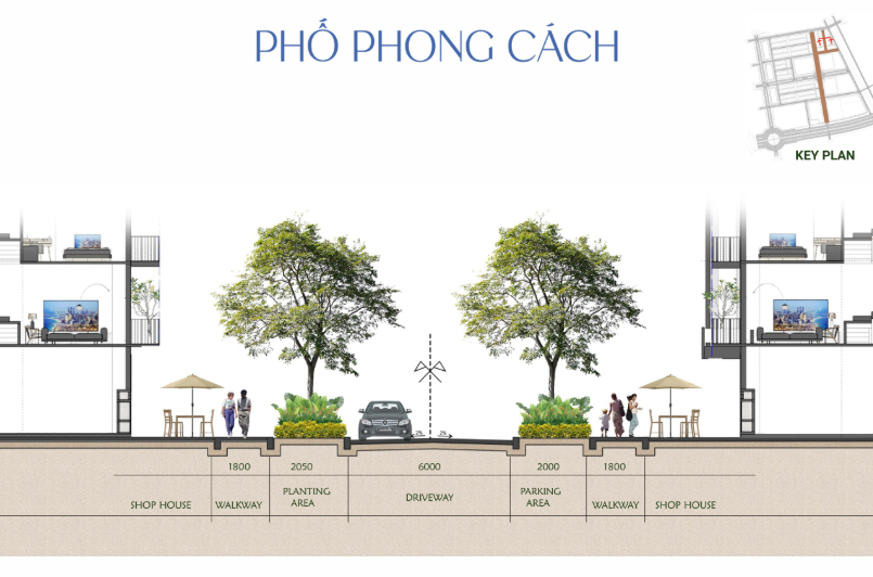 • Phố Phong Cách: Không gian linh hoạt, trẻ trung – nơi cư dân có thể gặp gỡ, thưởng thức cà phê ngoài trời hoặc đạp xe dạo chơi. Tuyến đường này tích hợp các tiện ích như bãi đỗ xe, ghế nghỉ, cây xanh và ô che nắng, tạo nên môi trường lý tưởng cho sinh hoạt cộng đồng và các hoạt động giải trí ngoài trời.