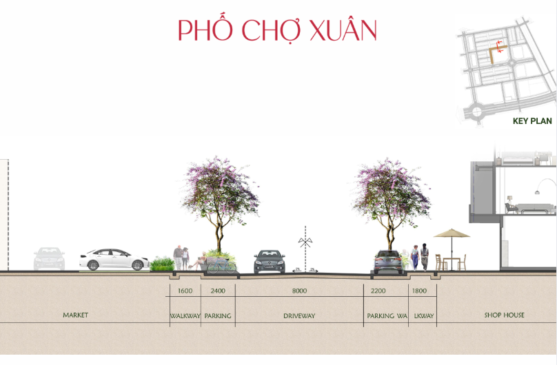 • Phố Chợ Xuân: Là trục thương mại sôi động, nơi diễn ra các hoạt động mua bán và giao thương nhộn nhịp. Họa tiết lát nền tạo hiệu ứng chuyển động sinh động, trong khi hàng cây đối xứng và lề đường rộng rãi hỗ trợ tối đa cho việc đỗ xe, vận chuyển và tiếp cận cửa hàng.