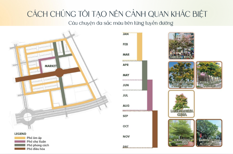 Bản đồ quy hoạch các tuyến đường nội khu Springville kèm hệ thống cây trồng theo mùa