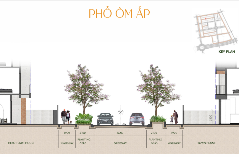 • Phố Ôm Ấp: Đây là tuyến đường dành cho cư dân yêu thích sự yên bình. Không gian được bao phủ bởi hai hàng cây Kèn Hồng rực rỡ vào mỗi mùa nở hoa, tạo nên khung cảnh nên thơ và cảm giác gần gũi, thư thái.